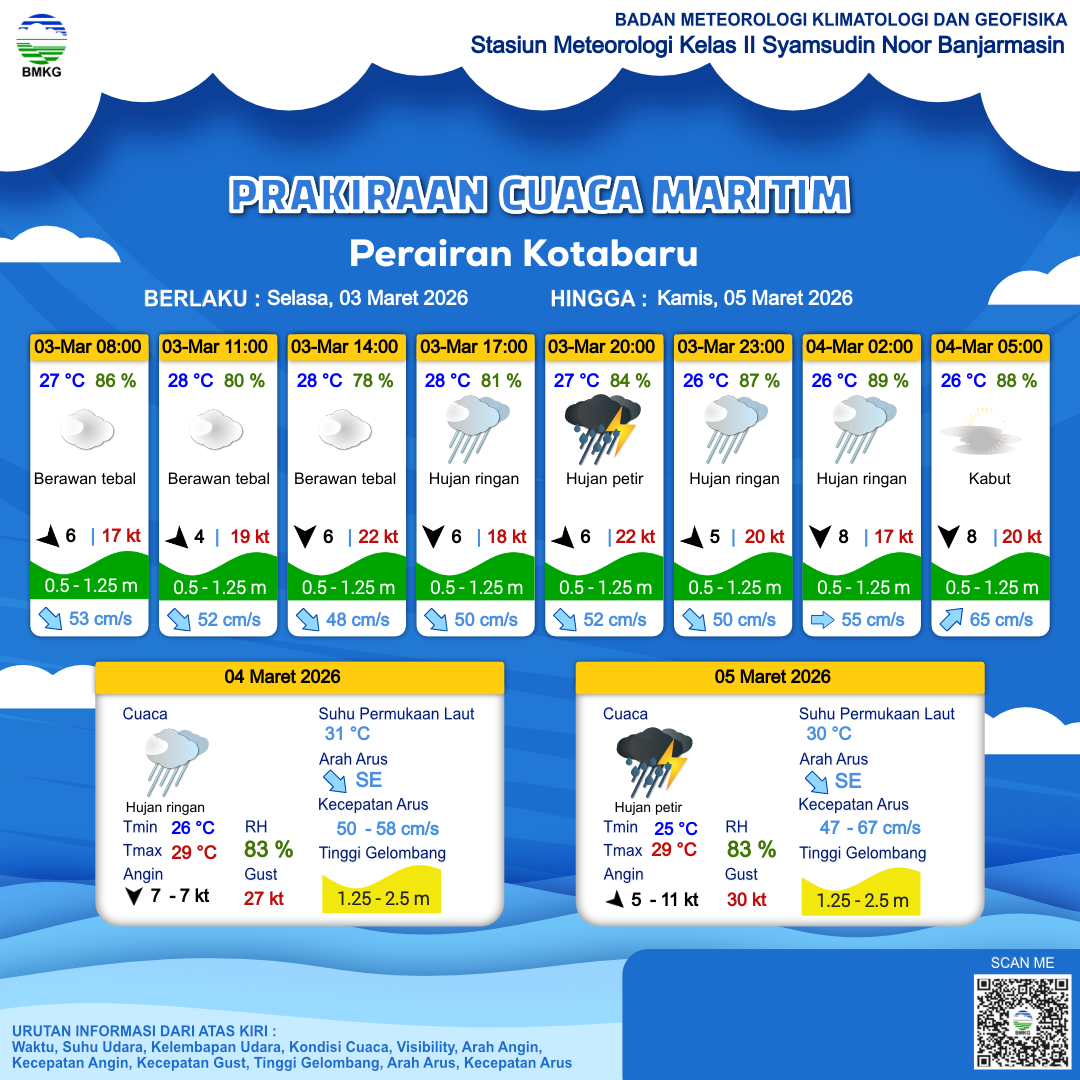 2 Mar 26, 23.00 3 jam kedepan | Berawan Tebal | Barat Laut 5 kt Gust Peningkatan kecepatan angin yang singkat dan tiba-tiba : 15 kt | | | 26 °C | 87 % |