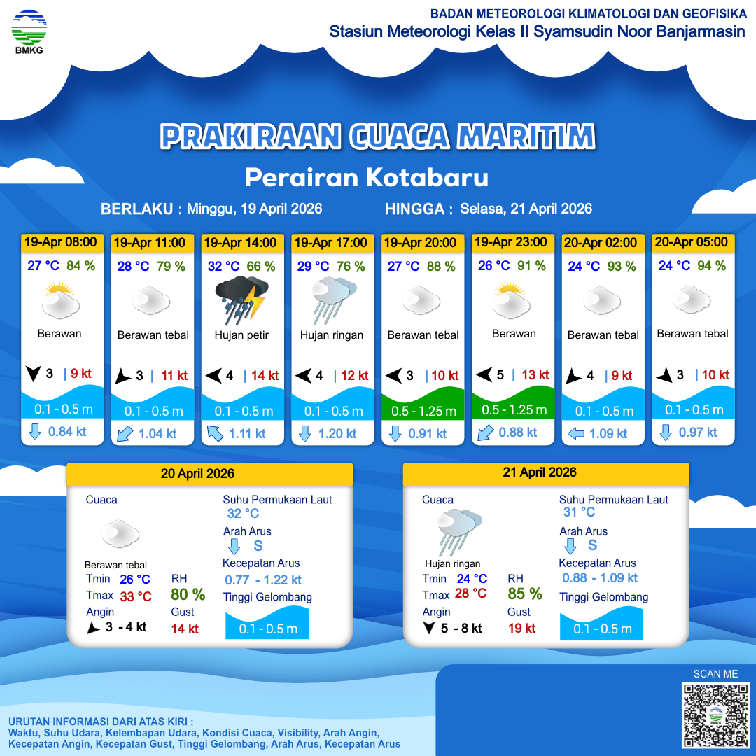 20 Apr 26, 06.00 2 jam kedepan | Timur Laut 4 kt Gust Peningkatan kecepatan angin yang singkat dan tiba-tiba : 14 kt | 0.4 m Tenang | Barat 1.0 Knots | 33 °C | 66 % | |