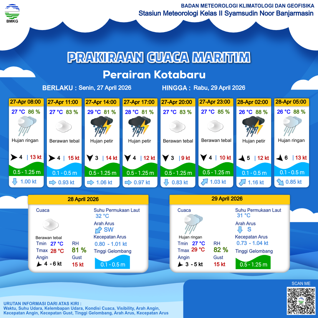 25 Apr 26, 22.00 4 jam kedepan | Berawan Tebal | Utara 3 kt Gust Peningkatan kecepatan angin yang singkat dan tiba-tiba : 13 kt | | | 27 °C | 86 % |