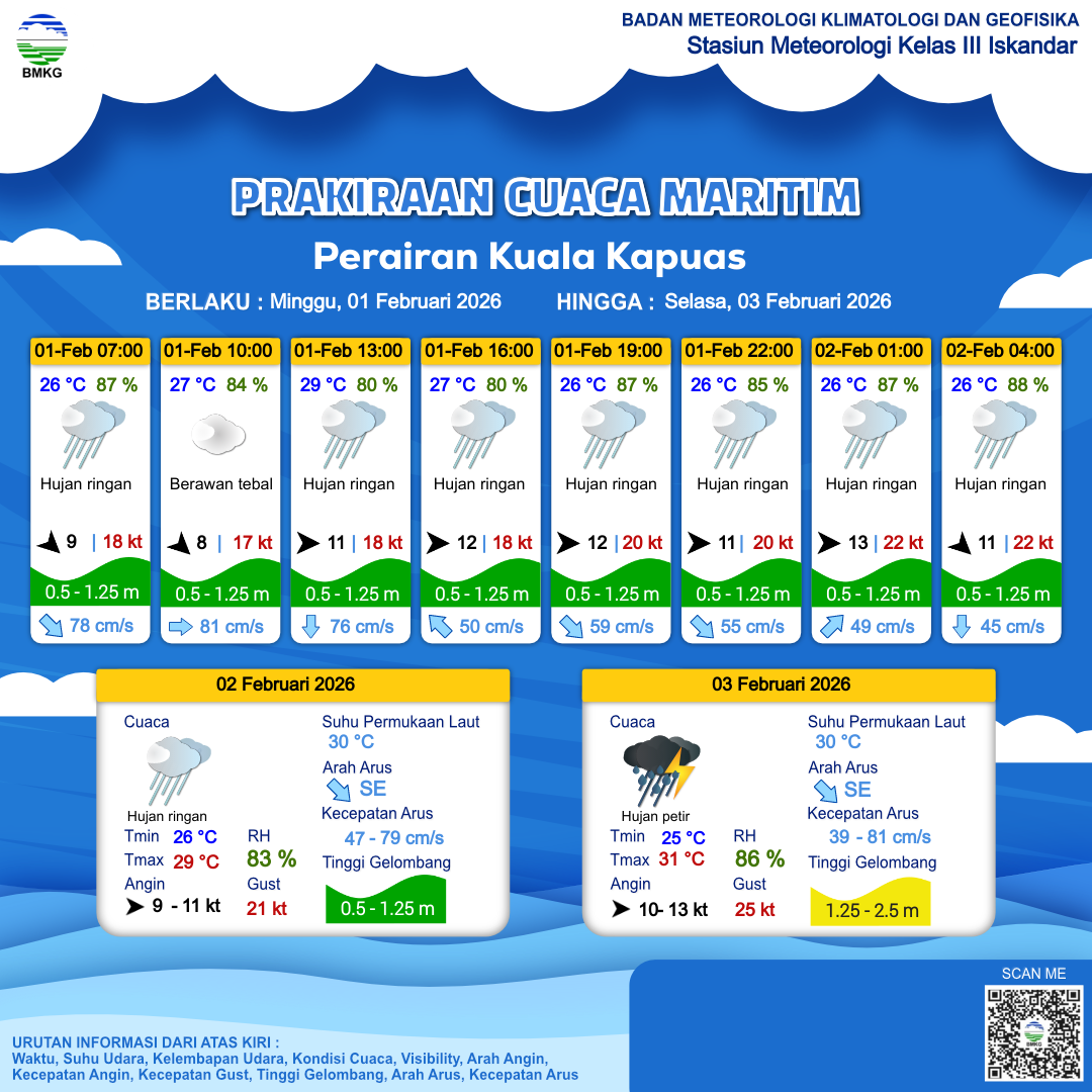 1 Feb 26, 06.00 12 jam yang lalu | Hujan Ringan | Barat 11 kt Gust Peningkatan kecepatan angin yang singkat dan tiba-tiba : 18 kt | | | 29 °C | 80 % |
