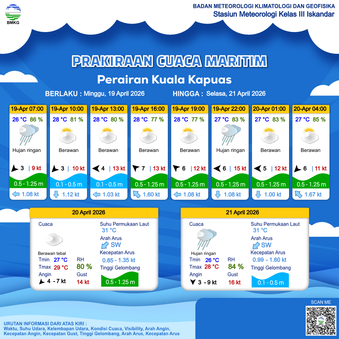 17 Apr 26, 00.00 20 jam yang lalu | Berawan | Timur Laut 7 kt Gust Peningkatan kecepatan angin yang singkat dan tiba-tiba : 12 kt | | | 27 °C | 89 % |