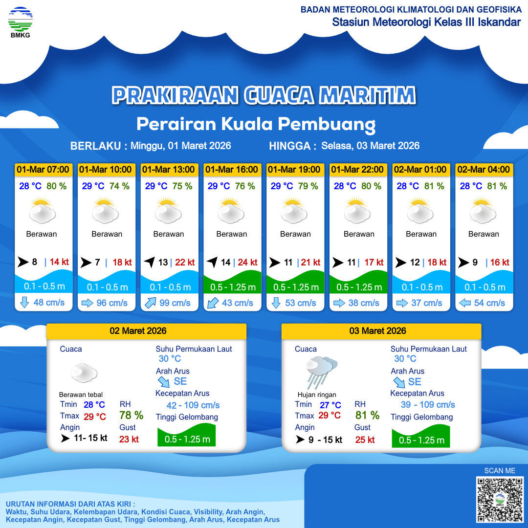 1 Mar 26, 20.00 4 jam kedepan | Barat 9 kt Gust Peningkatan kecepatan angin yang singkat dan tiba-tiba : 15 kt | 0.5 m Rendah | Barat 46.0 cm/s | 28 °C | 81 % | |