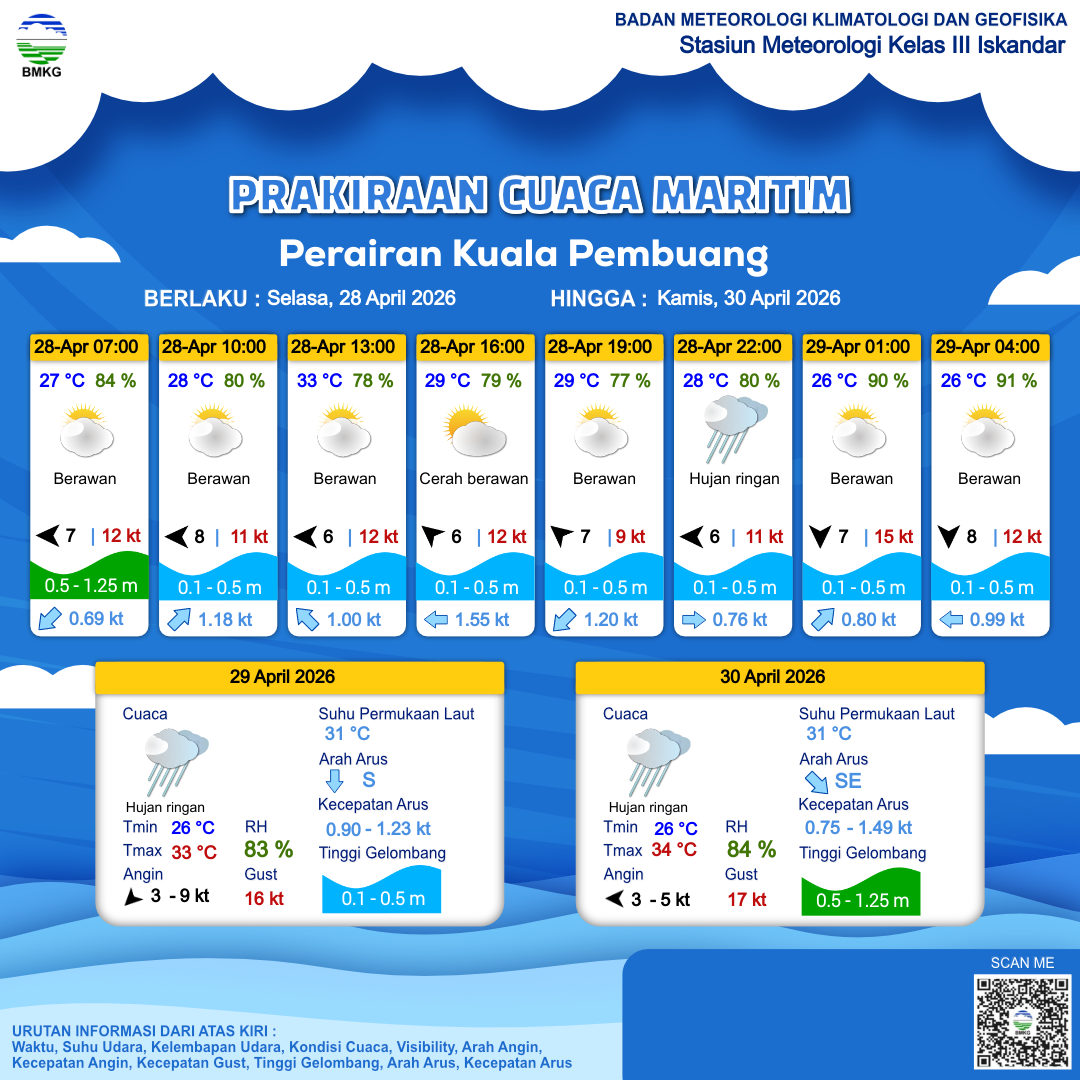 27 Apr 26, 08.00 3 jam kedepan | Tenggara 5 kt Gust Peningkatan kecepatan angin yang singkat dan tiba-tiba : 10 kt | 0.4 m Tenang | Barat 1.6 Knots | 29 °C | 79 % | |