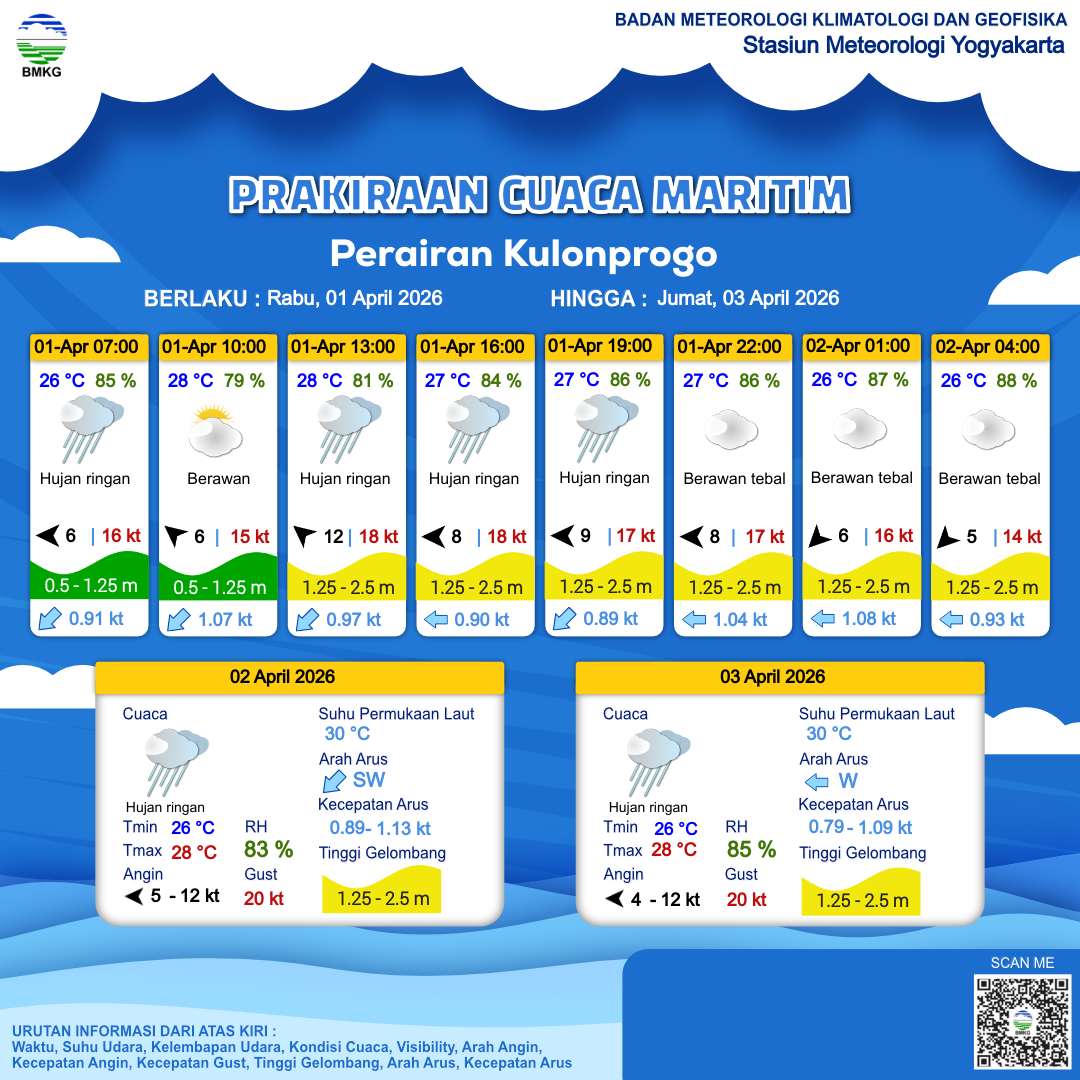 1 Apr 26, 04.00 4 jam kedepan | Tenggara 6 kt Gust Peningkatan kecepatan angin yang singkat dan tiba-tiba : 15 kt | 1.3 m Sedang | Barat Daya 1.1 Knots | 28 °C | 80 % | |