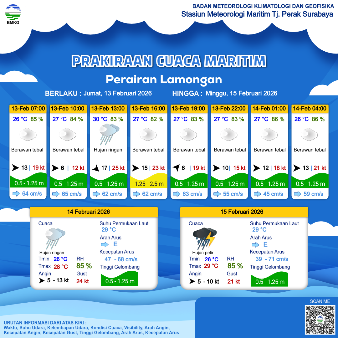 13 Feb 26, 10.00 2 jam kedepan | Barat 15 kt Gust Peningkatan kecepatan angin yang singkat dan tiba-tiba : 23 kt | 1.3 m Sedang | Timur 62.0 cm/s | 27 °C | 83 % | |