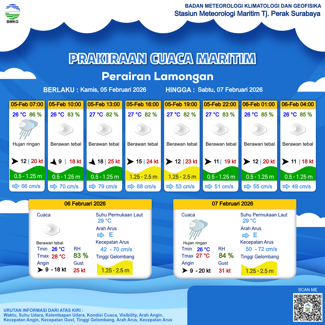 5 Feb 26, 08.00 3 jam kedepan | Barat 15 kt Gust Peningkatan kecepatan angin yang singkat dan tiba-tiba : 26 kt | 1.3 m Sedang | Timur 73.0 cm/s | 27 °C | 83 % | |