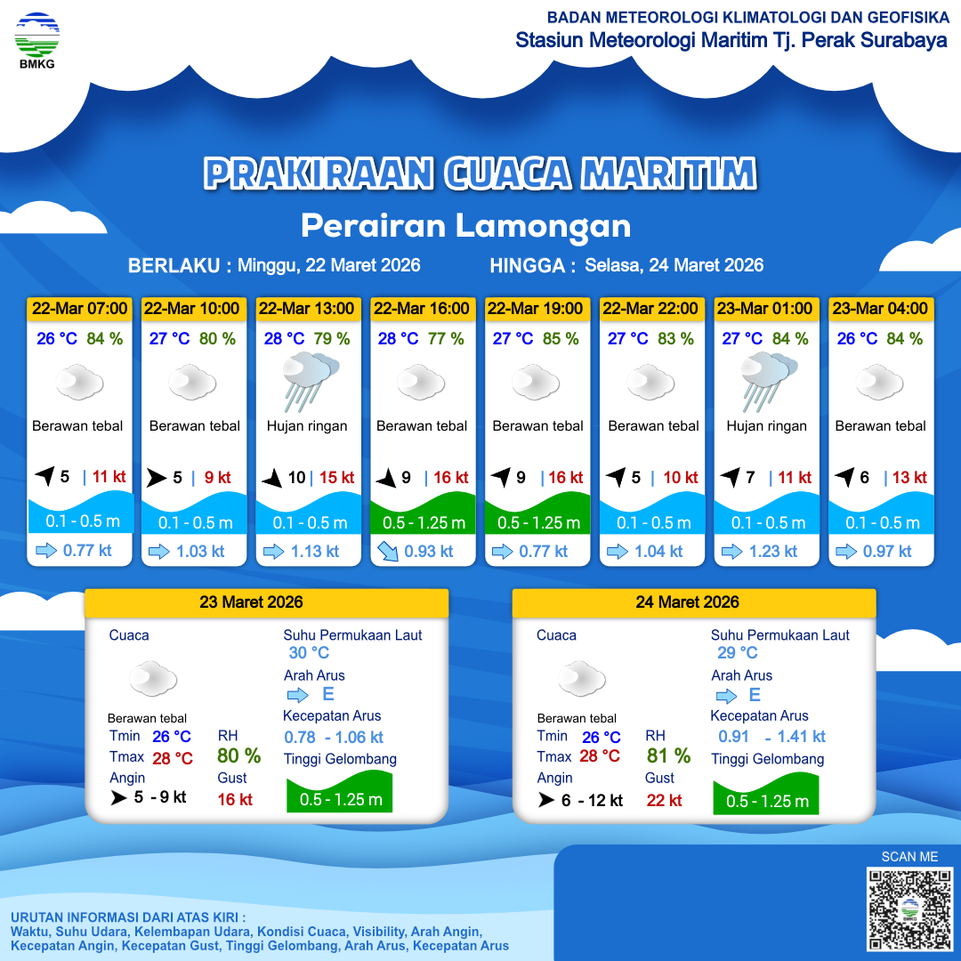 22 Mar 26, 22.00 2 jam kedepan | Berawan Tebal | Barat Daya 6 kt Gust Peningkatan kecepatan angin yang singkat dan tiba-tiba : 13 kt | | | 26 °C | 86 % |