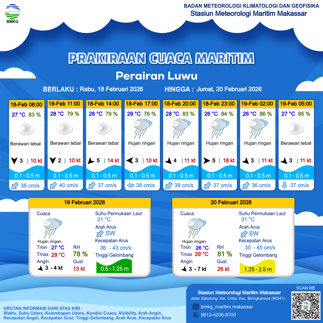 17 Feb 26, 23.00 2 jam kedepan | Hujan Ringan | Timur Laut 4 kt Gust Peningkatan kecepatan angin yang singkat dan tiba-tiba : 12 kt | | | 27 °C | 85 % |