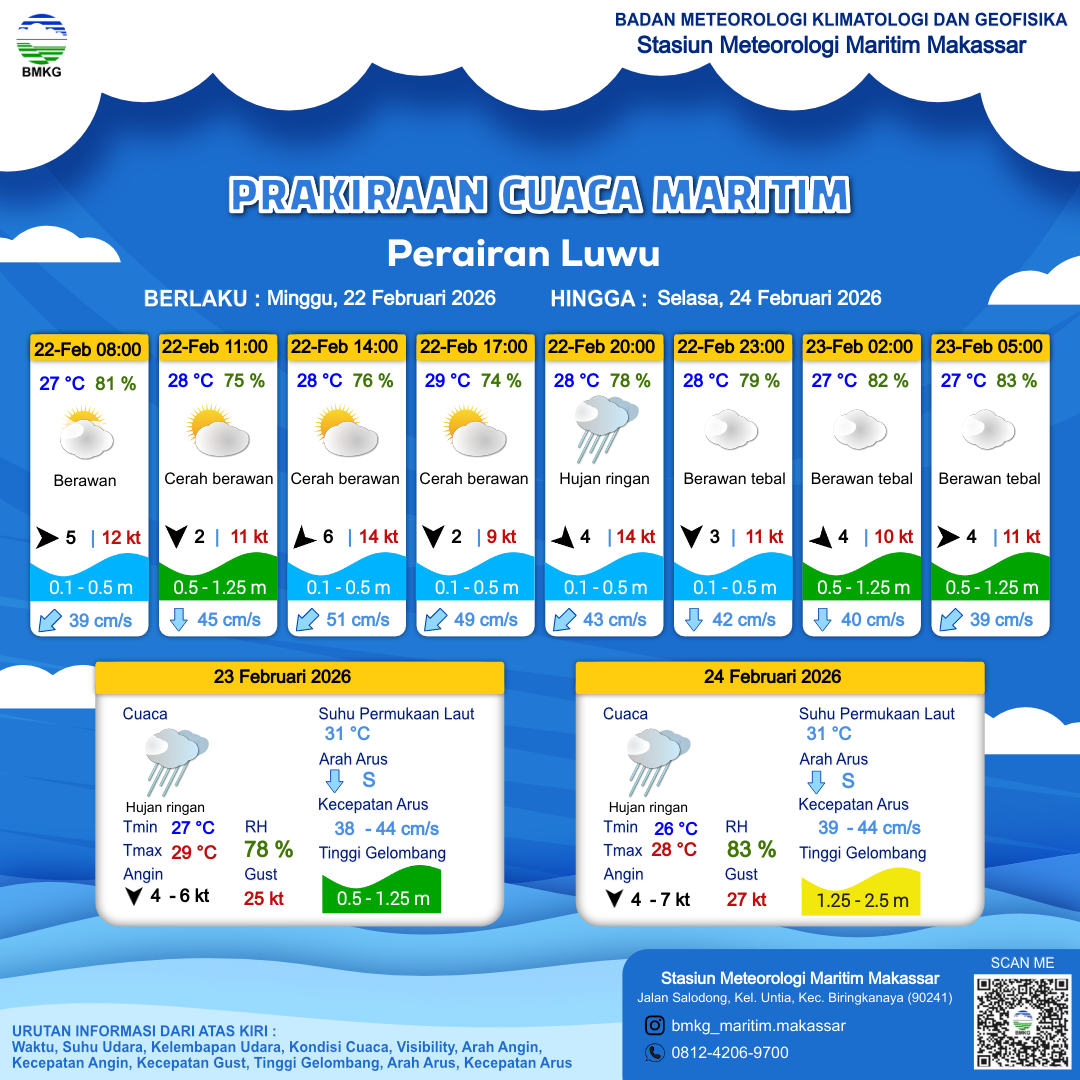 22 Feb 26, 13.00 14 jam kedepan | Barat Laut 4 kt Gust Peningkatan kecepatan angin yang singkat dan tiba-tiba : 14 kt | 0.1 m Tenang | Selatan 41.0 cm/s | 28 °C | 79 % | |