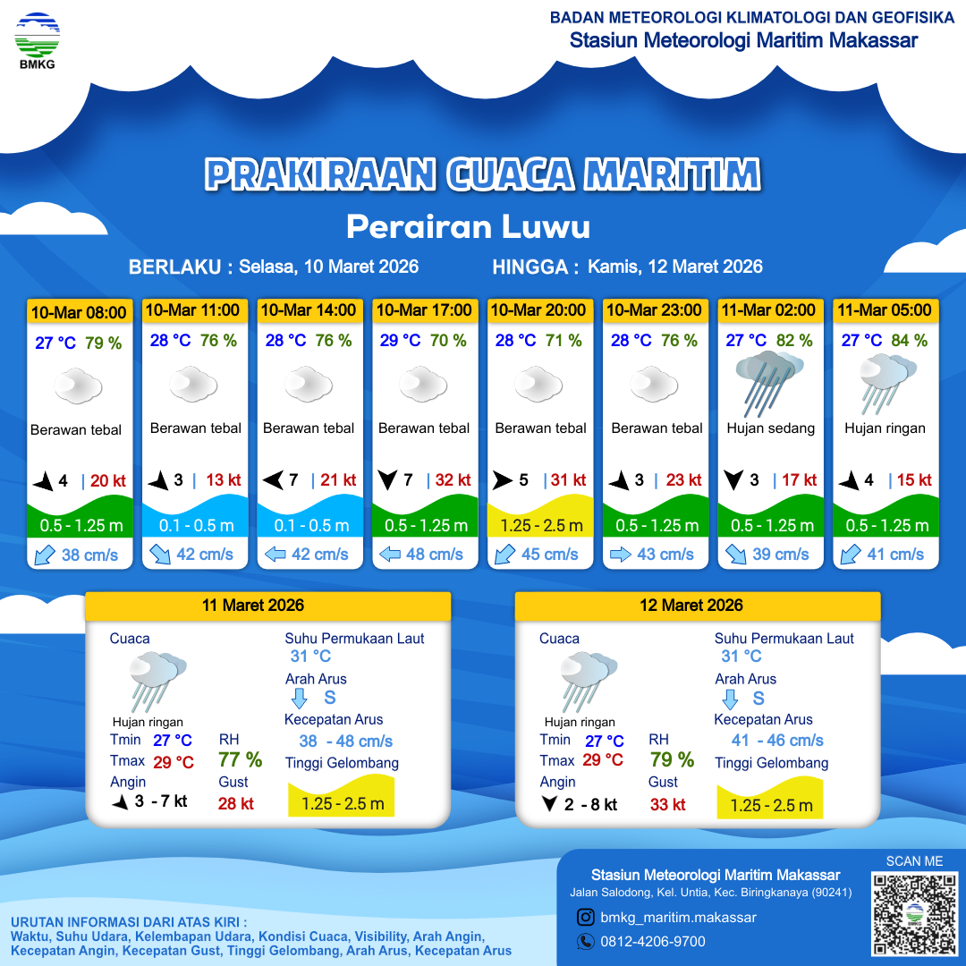 10 Mar 26, 16.00 4 jam kedepan | Barat Laut 3 kt Gust Peningkatan kecepatan angin yang singkat dan tiba-tiba : 22 kt | 0.9 m Rendah | Tenggara 43.0 cm/s | 28 °C | 77 % | |