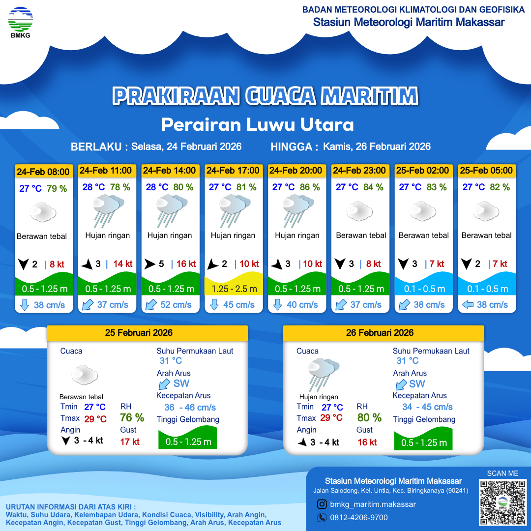 24 Feb 26, 23.00 4 jam kedepan | Berawan Tebal | Utara 3 kt Gust Peningkatan kecepatan angin yang singkat dan tiba-tiba : 9 kt | | | 27 °C | 83 % |