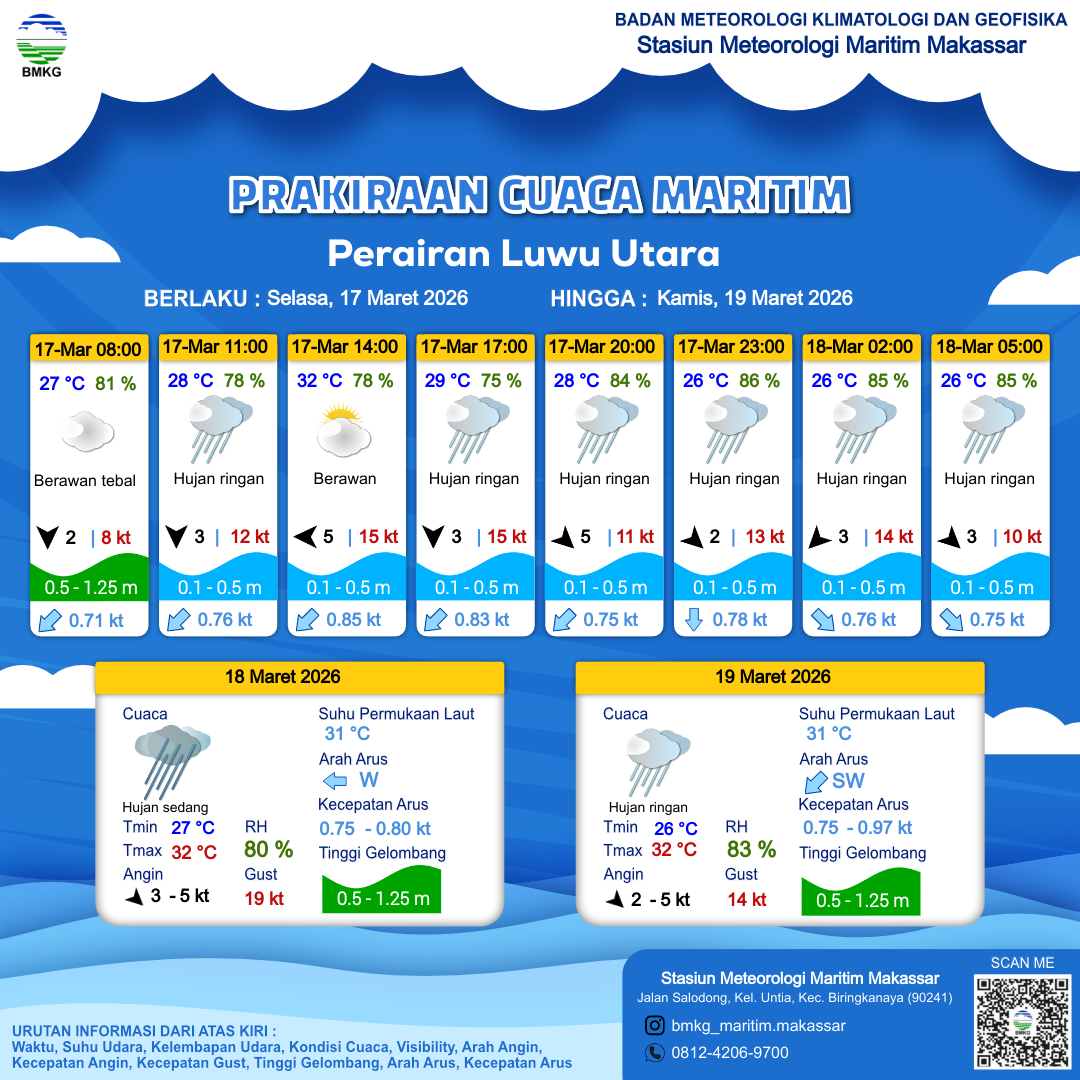 17 Mar 26, 09.00 4 jam kedepan | Utara 3 kt Gust Peningkatan kecepatan angin yang singkat dan tiba-tiba : 15 kt | 0.2 m Tenang | Barat Daya 0.8 Knots | 29 °C | 75 % | |
