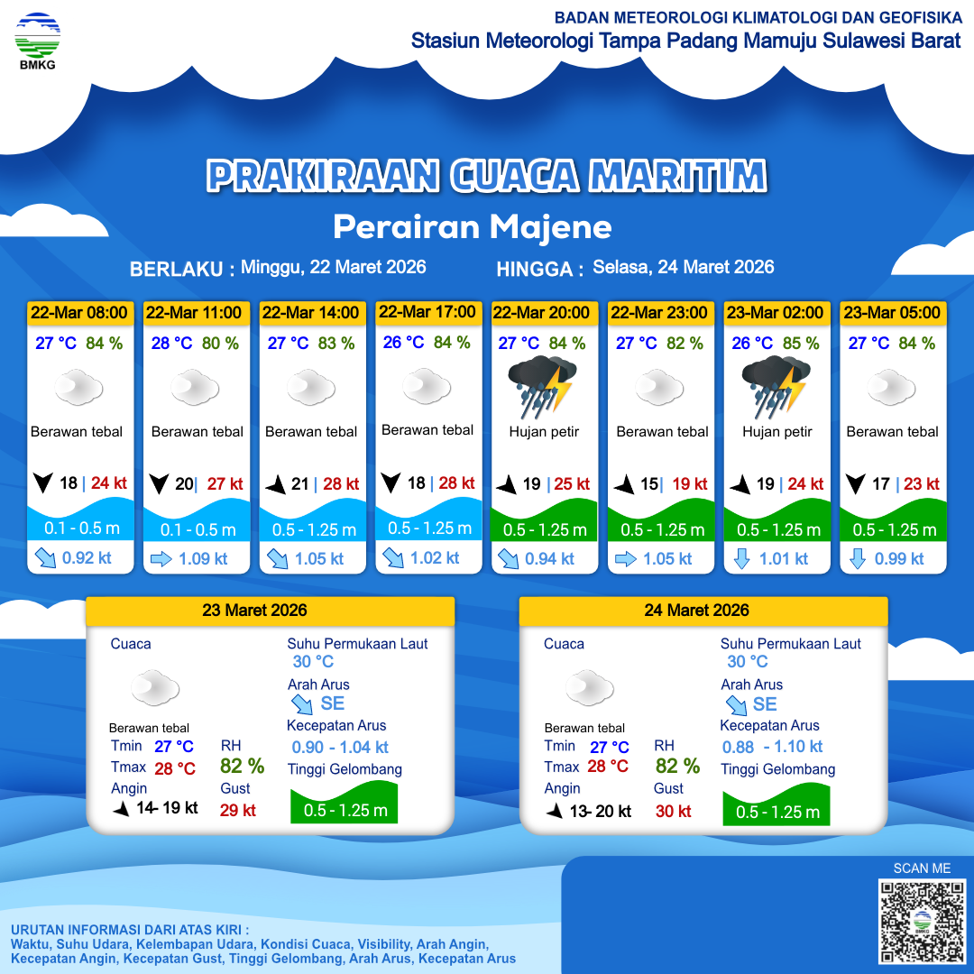 23 Mar 26, 08.00 9 jam kedepan | Barat Laut 18 kt Gust Peningkatan kecepatan angin yang singkat dan tiba-tiba : 29 kt | 1.1 m Rendah | Selatan 1.0 Knots | 28 °C | 83 % | |
