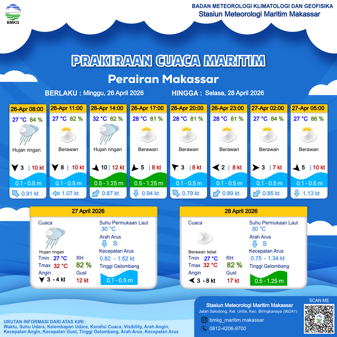 25 Apr 26, 17.00 2 jam kedepan | Timur 6 kt Gust Peningkatan kecepatan angin yang singkat dan tiba-tiba : 15 kt | 0.9 m Rendah | Barat 1.1 Knots | 27 °C | 84 % | |