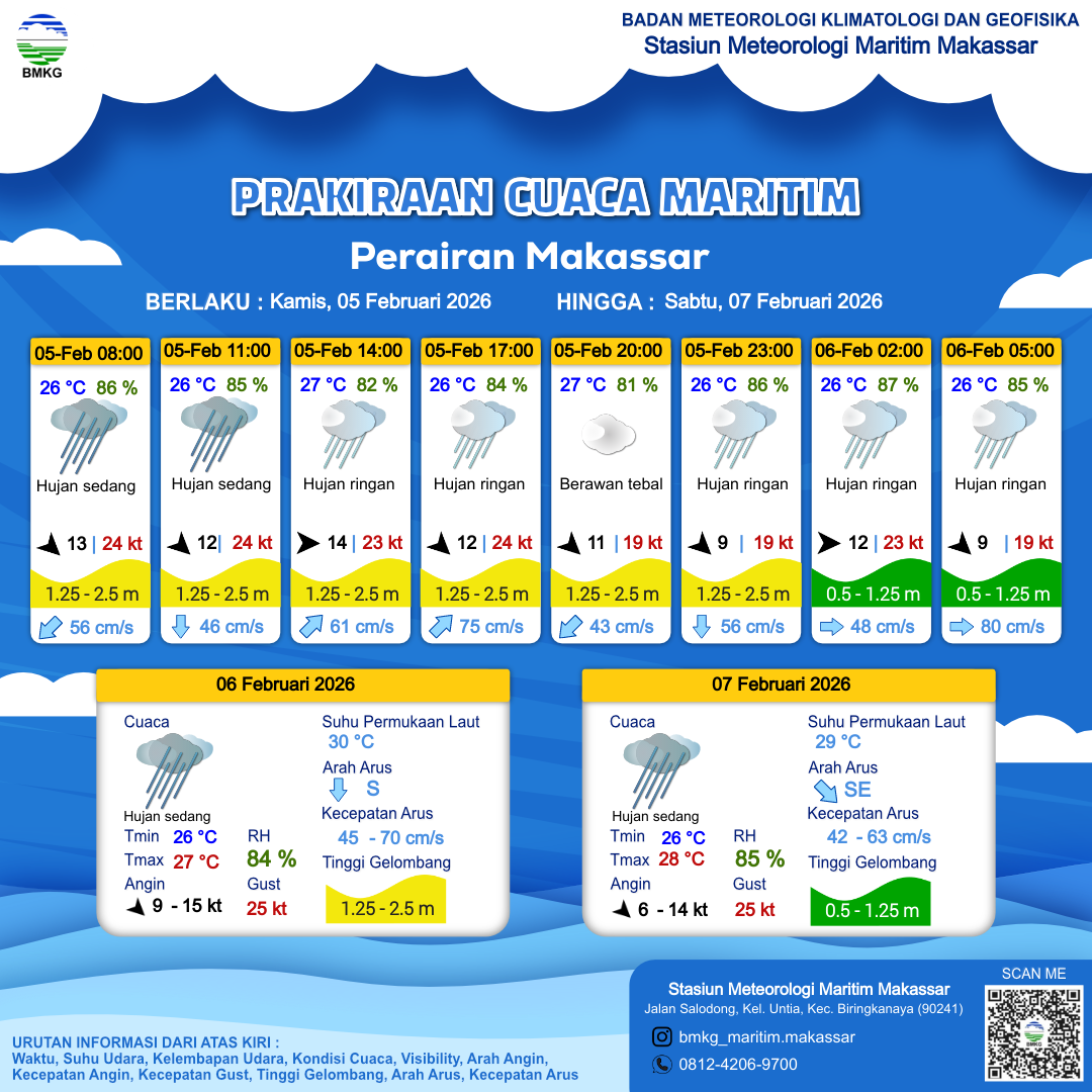 5 Feb 26, 18.00 7 jam kedepan | Barat 12 kt Gust Peningkatan kecepatan angin yang singkat dan tiba-tiba : 23 kt | 1.2 m Rendah | Timur 48.0 cm/s | 26 °C | 87 % | |