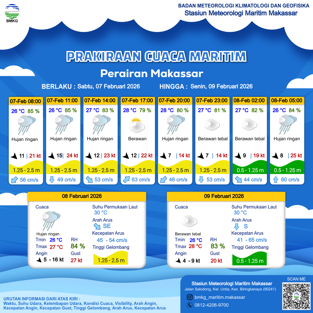7 Feb 26, 03.00 2 jam kedepan | Barat Laut 15 kt Gust Peningkatan kecepatan angin yang singkat dan tiba-tiba : 24 kt | 1.3 m Sedang | Selatan 49.0 cm/s | 26 °C | 85 % | |