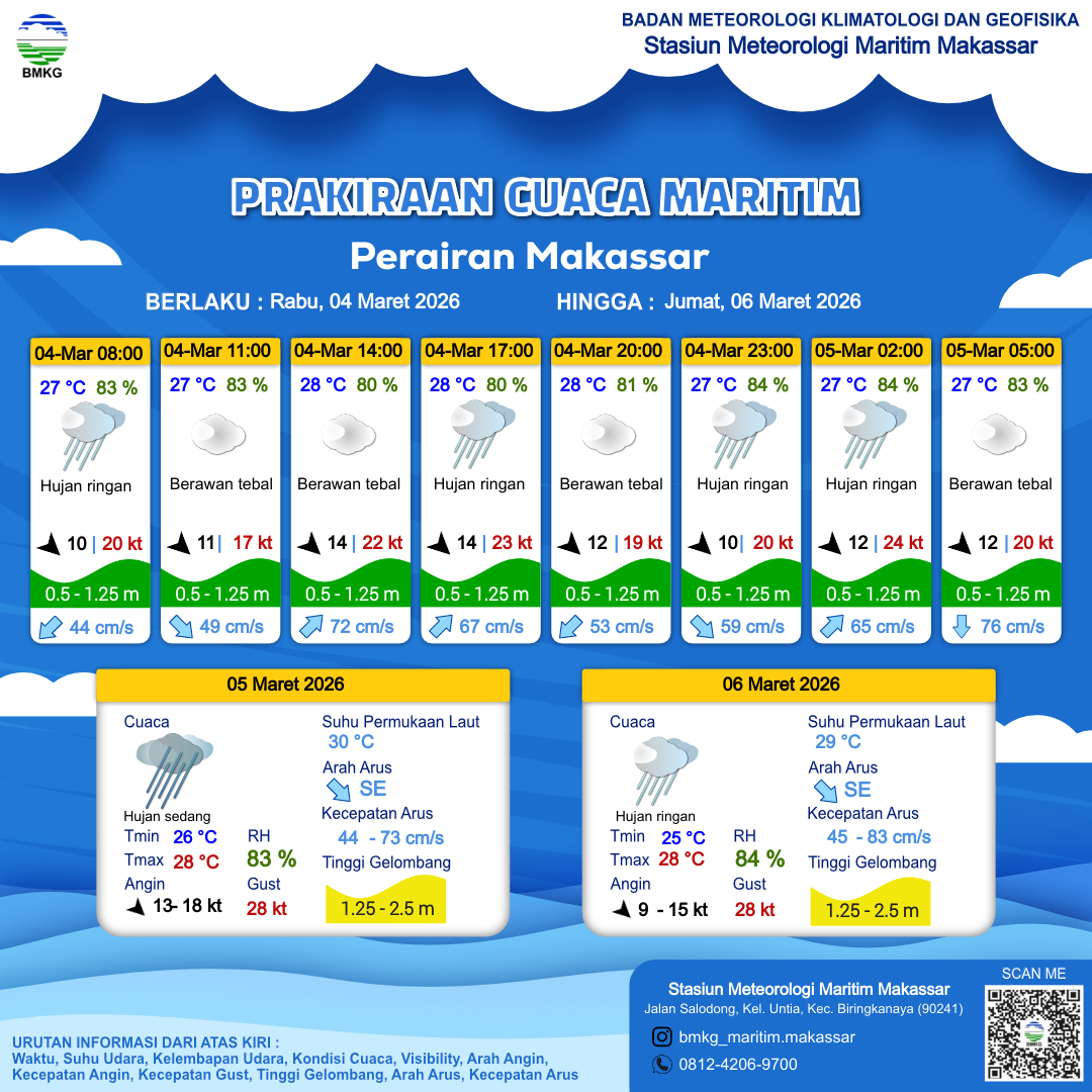 5 Mar 26, 13.00 14 jam kedepan | Barat Laut 11 kt Gust Peningkatan kecepatan angin yang singkat dan tiba-tiba : 19 kt | 1.3 m Sedang | Selatan 70.0 cm/s | 28 °C | 80 % | |