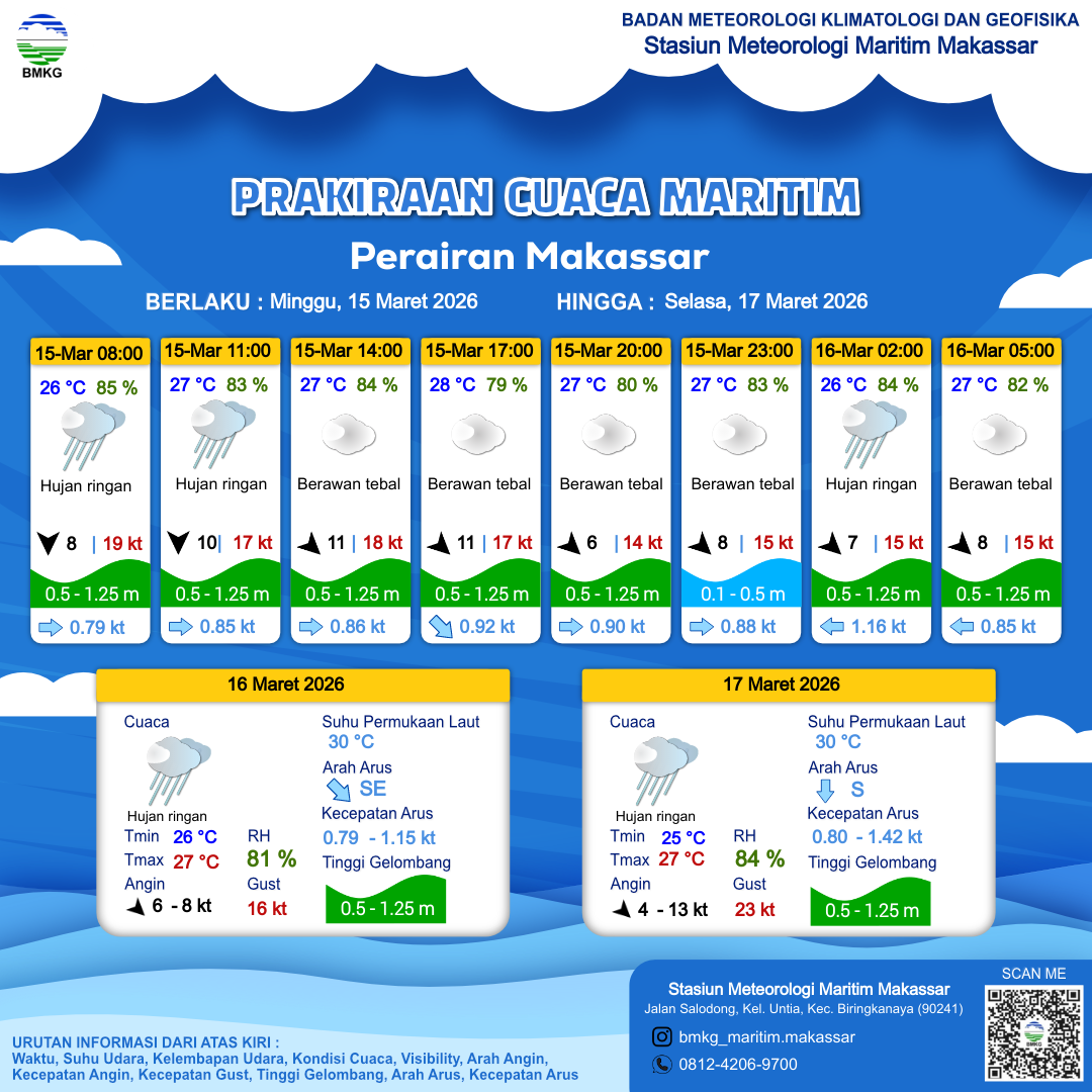 15 Mar 26, 08.00 2 jam kedepan | Barat Laut 11 kt Gust Peningkatan kecepatan angin yang singkat dan tiba-tiba : 16 kt | 0.6 m Rendah | Timur 0.9 cm/s | 28 °C | 80 % | |