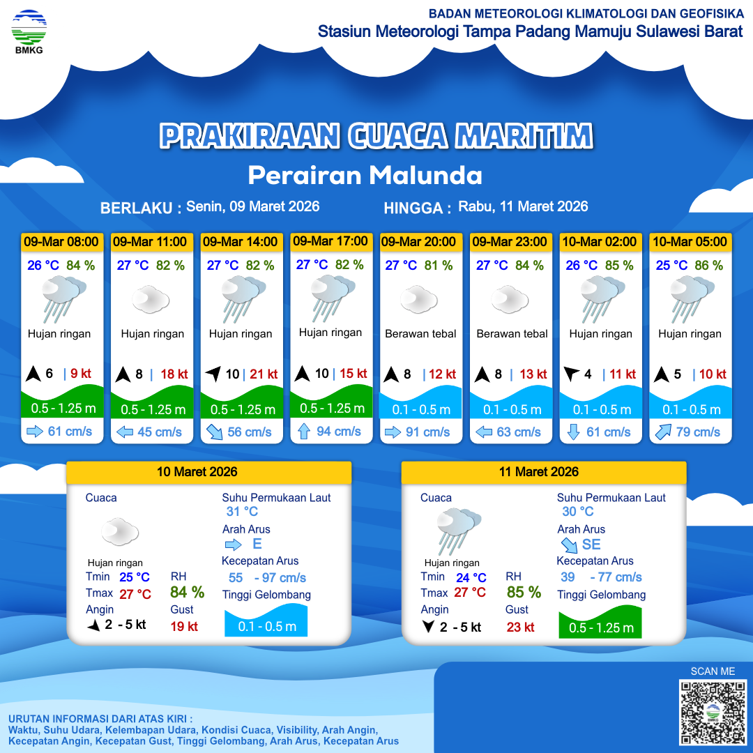 9 Mar 26, 20.00 3 jam kedepan | Hujan Ringan | Timur 3 kt Gust Peningkatan kecepatan angin yang singkat dan tiba-tiba : 14 kt | | | 25 °C | 86 % |