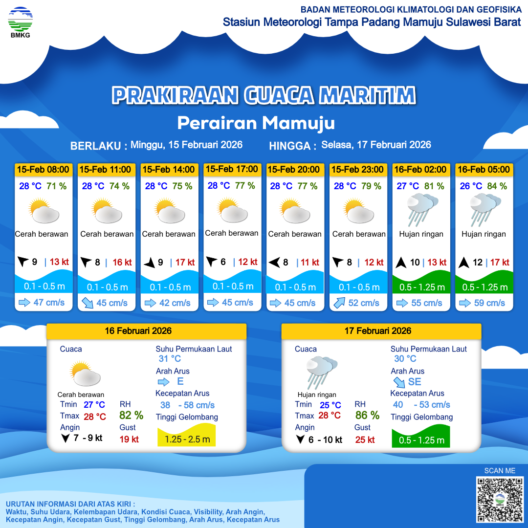 15 Feb 26, 17.00 2 jam kedepan | Timur Laut 5 kt Gust Peningkatan kecepatan angin yang singkat dan tiba-tiba : 12 kt | 0.6 m Rendah | Timur Laut 55.0 cm/s | 27 °C | 80 % | |