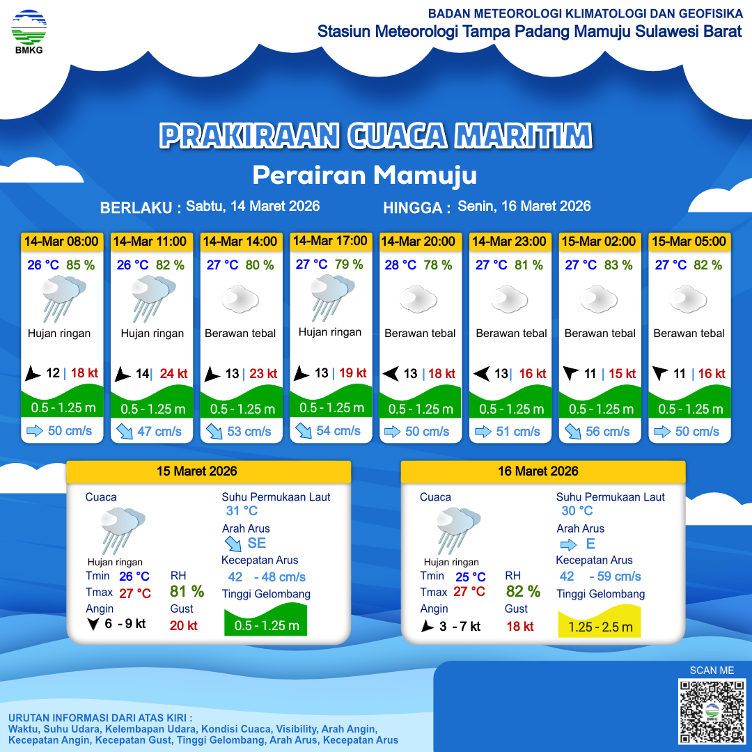 14 Mar 26, 22.00 4 jam kedepan | Hujan Ringan | Timur Laut 7 kt Gust Peningkatan kecepatan angin yang singkat dan tiba-tiba : 17 kt | | | 27 °C | 82 % |