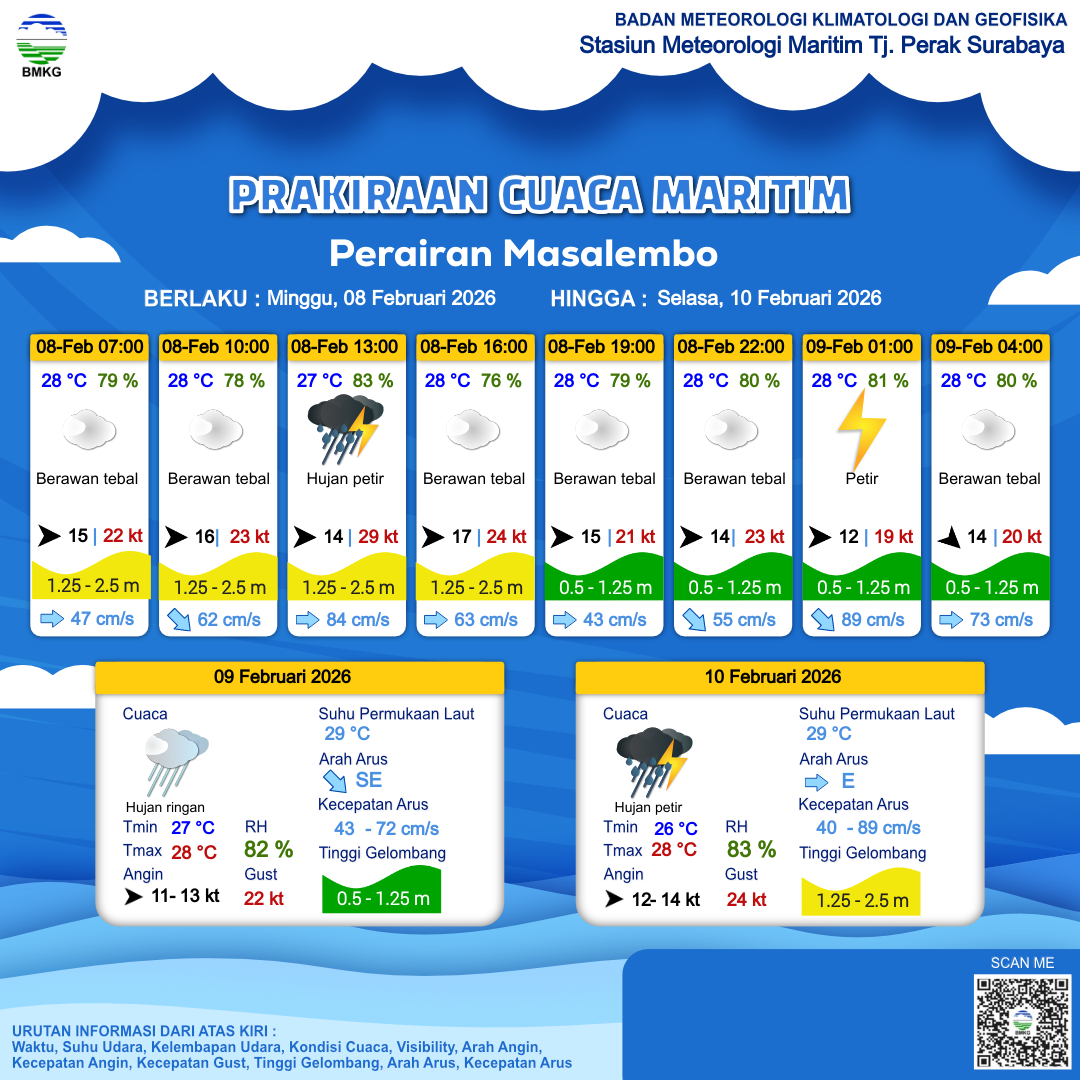 8 Feb 26, 08.00 3 jam kedepan | Barat 17 kt Gust Peningkatan kecepatan angin yang singkat dan tiba-tiba : 22 kt | 1.3 m Sedang | Timur 74.0 cm/s | 28 °C | 77 % | |