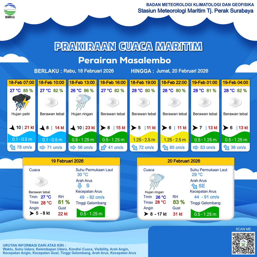 17 Feb 26, 23.00 2 jam kedepan | Hujan Ringan | Barat Laut 12 kt Gust Peningkatan kecepatan angin yang singkat dan tiba-tiba : 17 kt | | | 27 °C | 82 % |