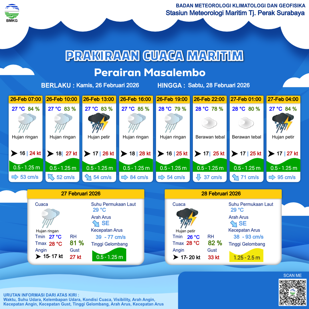 26 Feb 26, 08.00 2 jam kedepan | Barat 18 kt Gust Peningkatan kecepatan angin yang singkat dan tiba-tiba : 28 kt | 0.9 m Rendah | Tenggara 80.0 cm/s | 27 °C | 83 % | |