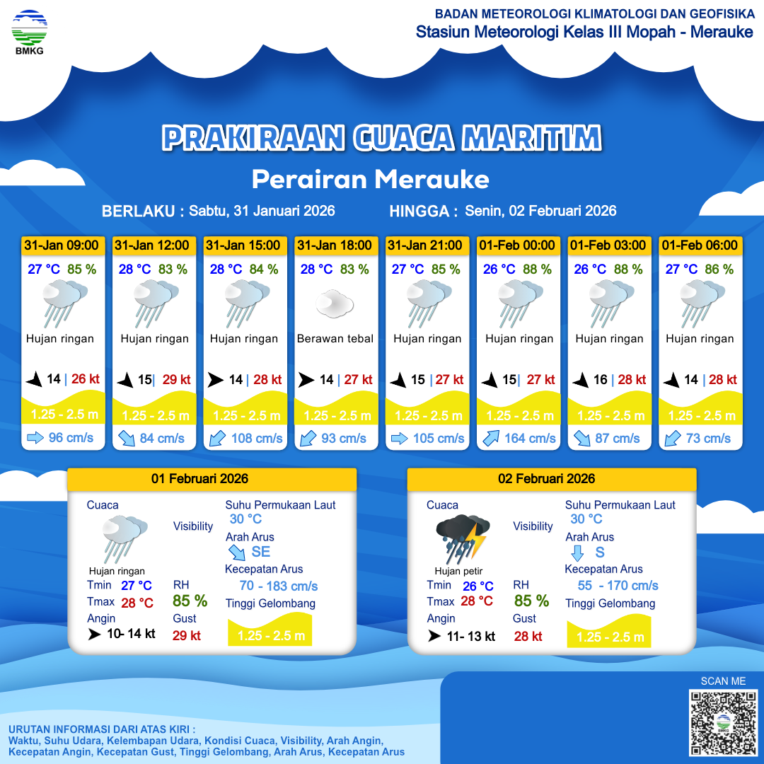 31 Jan 26, 08.00 4 jam kedepan | Barat 14 kt Gust Peningkatan kecepatan angin yang singkat dan tiba-tiba : 27 kt | 1.9 m Sedang | Barat Daya 103.0 cm/s | 28 °C | 82 % | |