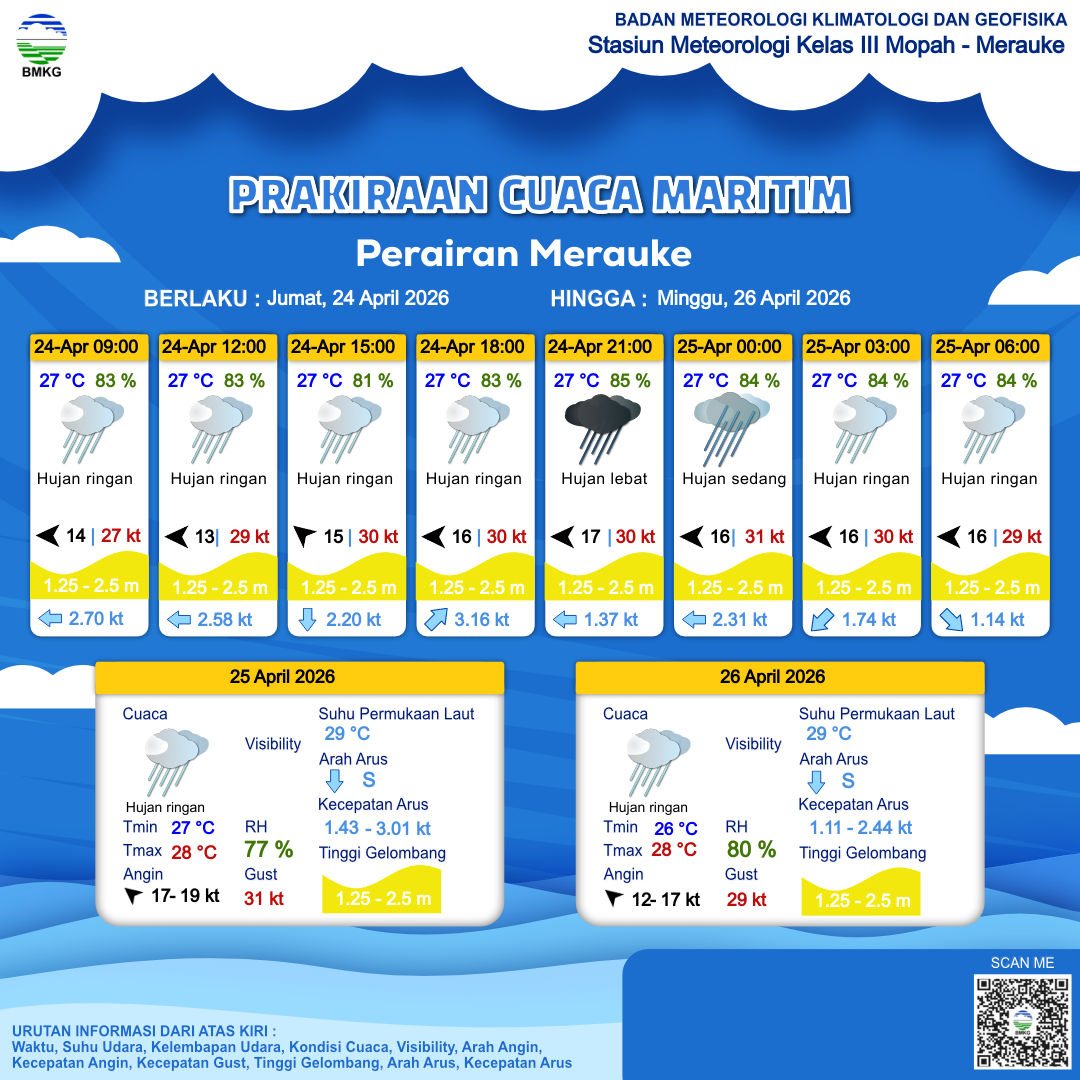 23 Apr 26, 23.00 3 jam kedepan | Hujan Ringan | Timur 14 kt Gust Peningkatan kecepatan angin yang singkat dan tiba-tiba : 26 kt | | | 27 °C | 84 % |
