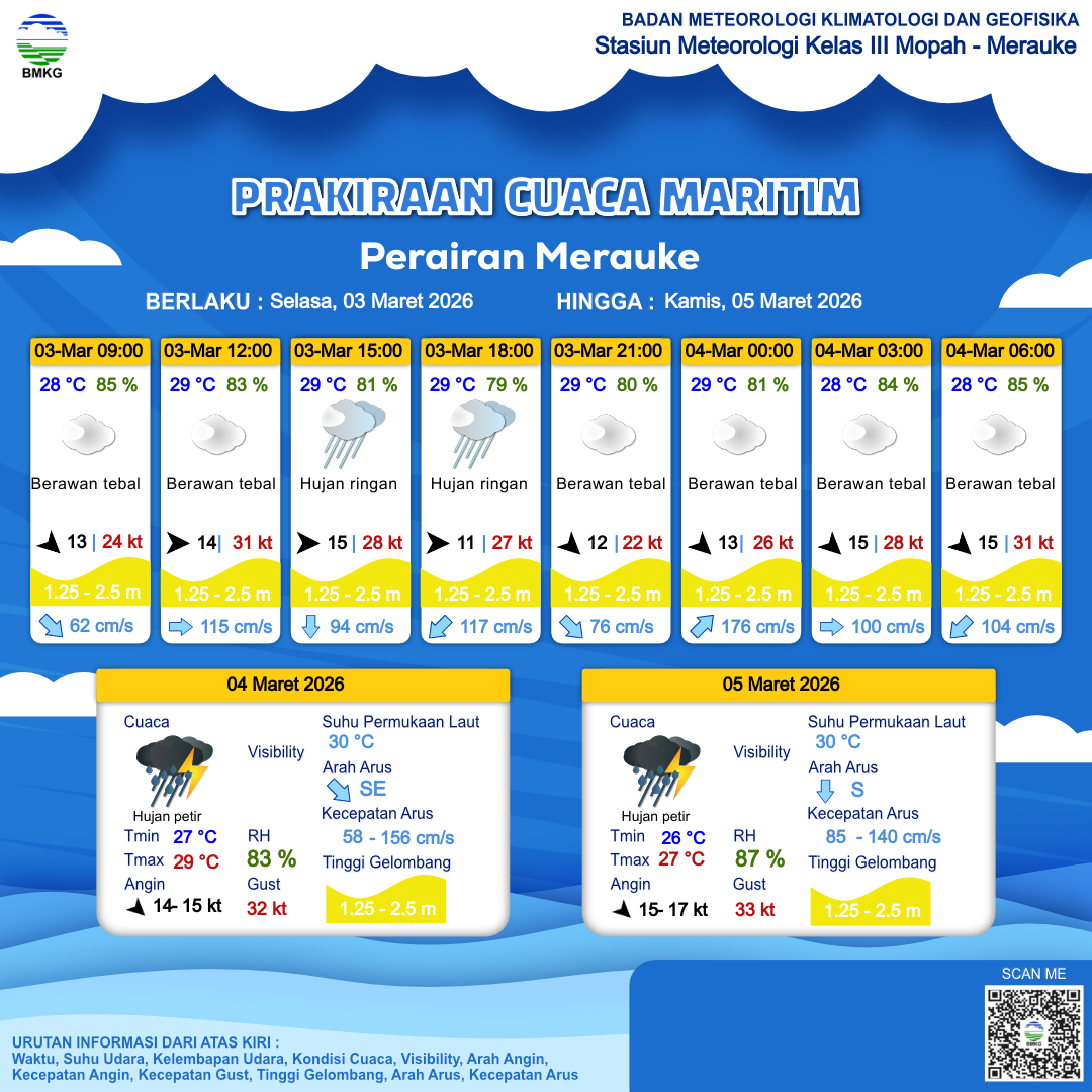 3 Mar 26, 06.00 4 jam kedepan | Barat 15 kt Gust Peningkatan kecepatan angin yang singkat dan tiba-tiba : 28 kt | 1.4 m Sedang | Selatan 94.0 cm/s | 29 °C | 81 % | |