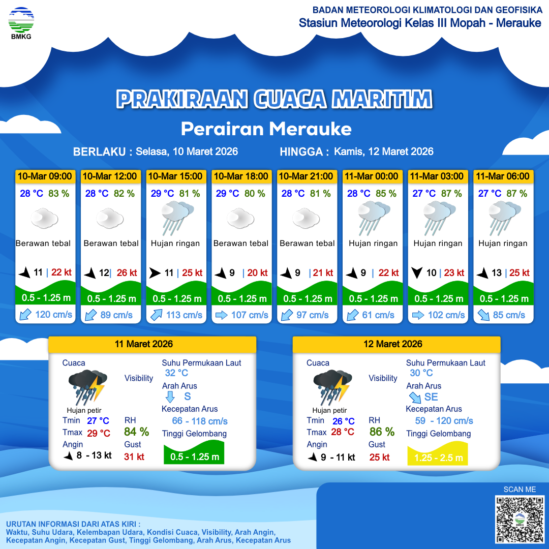 10 Mar 26, 07.00 2 jam kedepan | Barat 11 kt Gust Peningkatan kecepatan angin yang singkat dan tiba-tiba : 21 kt | 1.1 m Rendah | Timur Laut 136.0 cm/s | 29 °C | 81 % | |