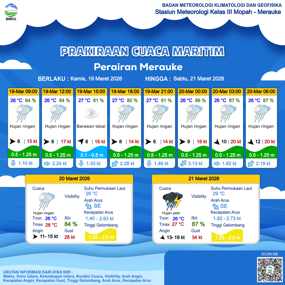 19 Mar 26, 17.00 2 jam kedepan | Barat Laut 10 kt Gust Peningkatan kecepatan angin yang singkat dan tiba-tiba : 20 kt | 0.7 m Rendah | Timur 2.6 Knots | 26 °C | 87 % | |