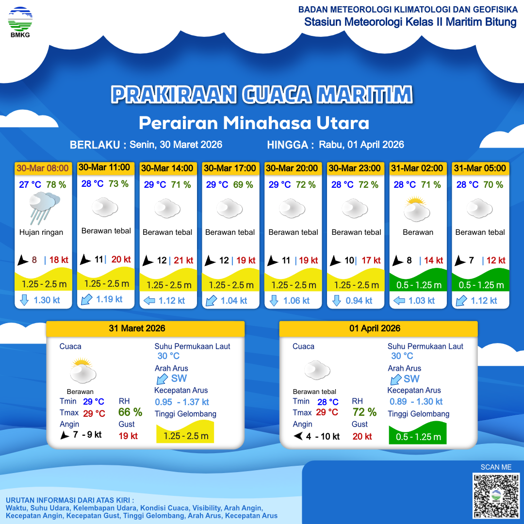 30 Mar 26, 03.00 2 jam kedepan | Timur Laut 11 kt Gust Peningkatan kecepatan angin yang singkat dan tiba-tiba : 20 kt | 1.3 m Sedang | Barat Daya 1.2 Knots | 28 °C | 73 % | |