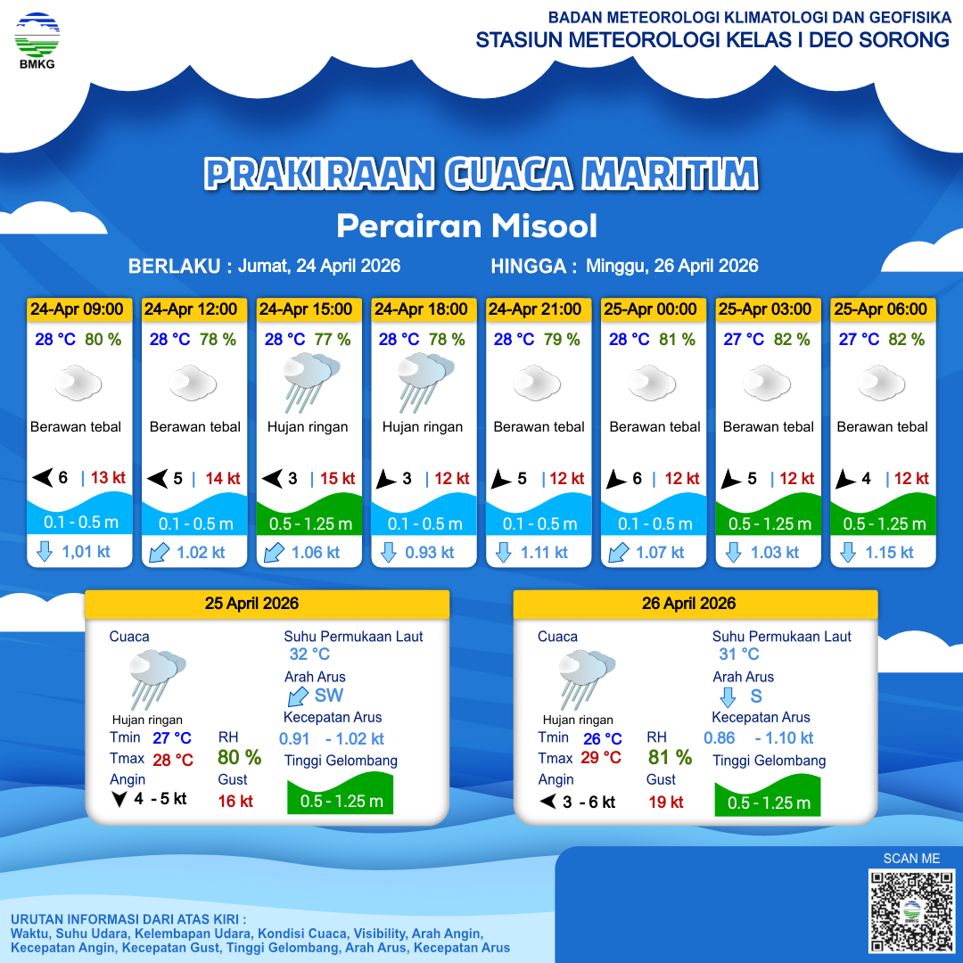 25 Apr 26, 06.00 15 jam kedepan | Utara 3 kt Gust Peningkatan kecepatan angin yang singkat dan tiba-tiba : 16 kt | 0.5 m Rendah | Barat Daya 1.0 Knots | 28 °C | 78 % | |