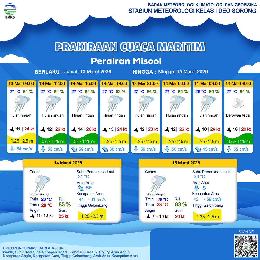 13 Mar 26, 07.00 4 jam kedepan | Barat Laut 14 kt Gust Peningkatan kecepatan angin yang singkat dan tiba-tiba : 28 kt | 1.7 m Sedang | Tenggara 61.0 cm/s | 27 °C | 84 % | |
