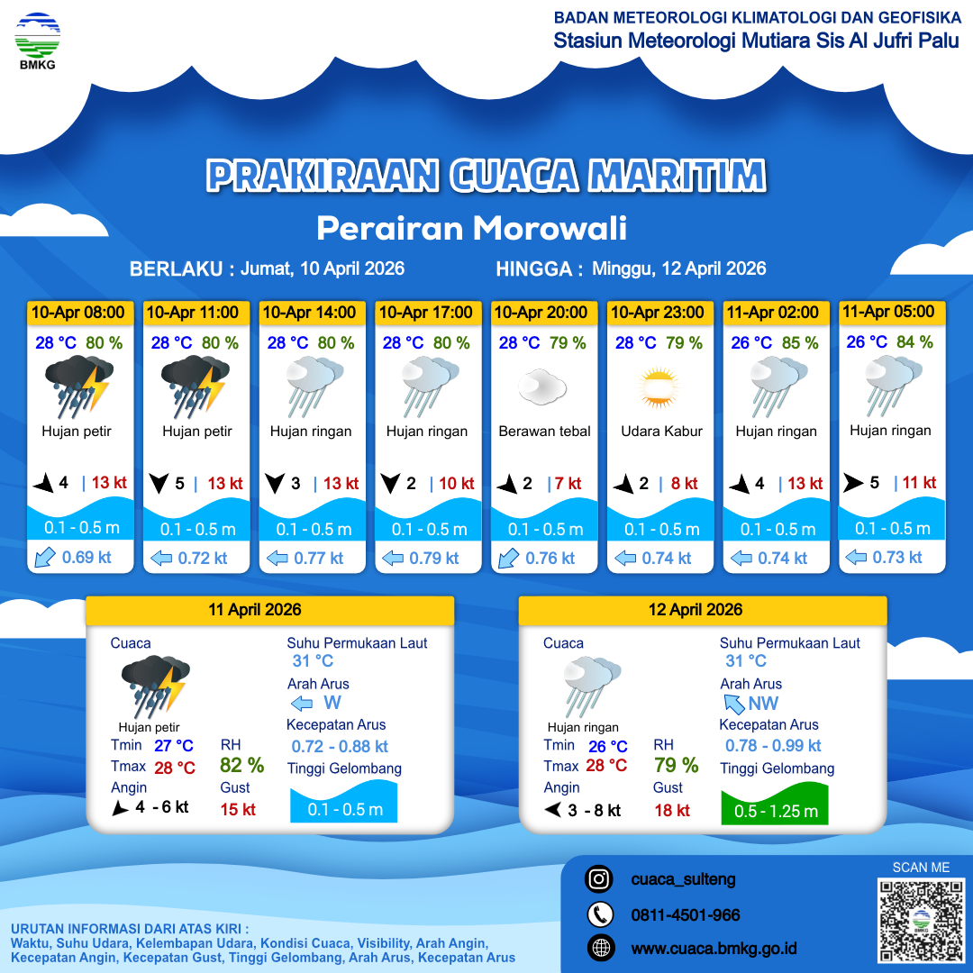 10 Apr 26, 09.00 3 jam kedepan | Utara 2 kt Gust Peningkatan kecepatan angin yang singkat dan tiba-tiba : 10 kt | 0.3 m Tenang | Barat 0.8 Knots | 28 °C | 80 % | |