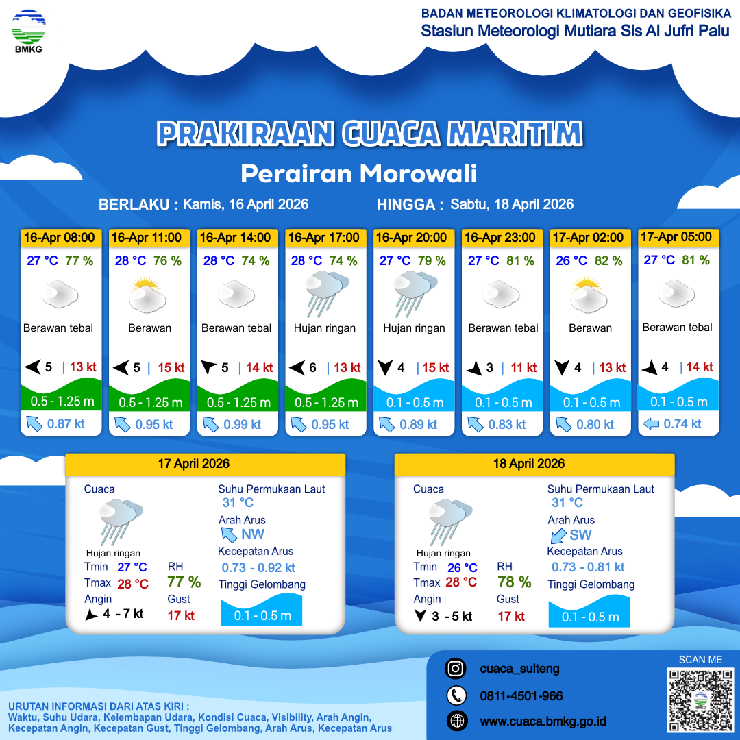 16 Apr 26, 09.00 5 jam kedepan | Timur 6 kt Gust Peningkatan kecepatan angin yang singkat dan tiba-tiba : 13 kt | 0.6 m Rendah | Barat Laut 0.9 Knots | 28 °C | 74 % | |