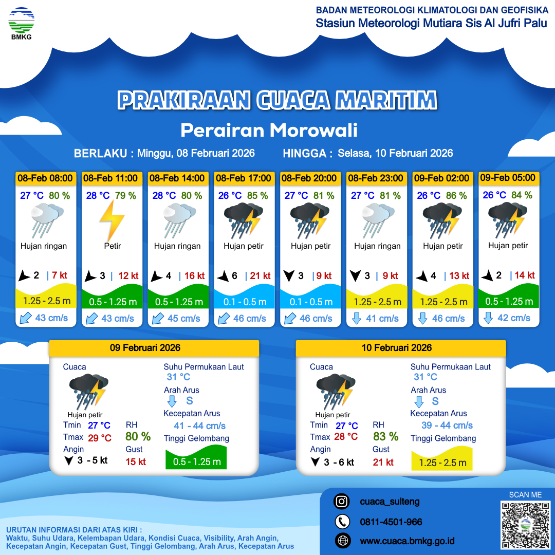 8 Feb 26, 23.00 4 jam kedepan | Hujan Ringan | Utara 4 kt Gust Peningkatan kecepatan angin yang singkat dan tiba-tiba : 11 kt | | | 27 °C | 83 % |