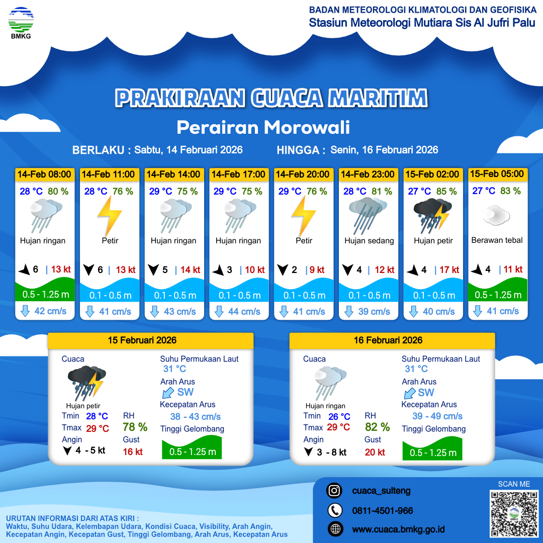 14 Feb 26, 14.00 3 jam kedepan | Utara 4 kt Gust Peningkatan kecepatan angin yang singkat dan tiba-tiba : 10 kt | 0.4 m Tenang | Selatan 39.0 cm/s | 28 °C | 78 % | |