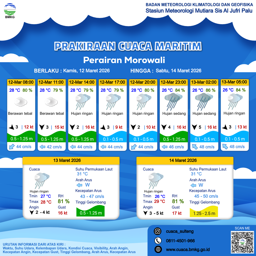 11 Mar 26, 22.00 4 jam kedepan | Hujan Ringan | Utara 4 kt Gust Peningkatan kecepatan angin yang singkat dan tiba-tiba : 13 kt | | | 26 °C | 86 % |