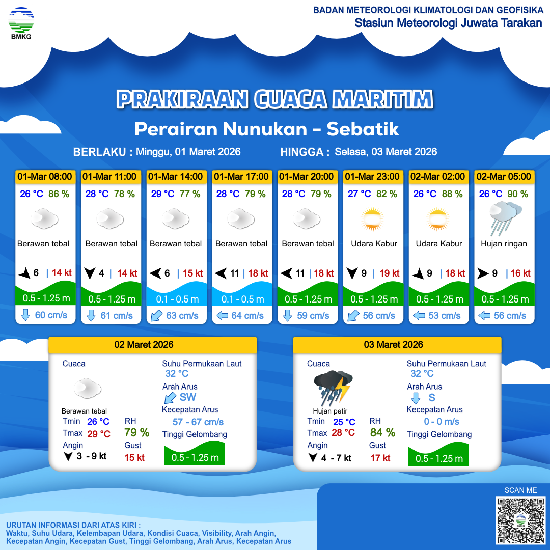 1 Mar 26, 23.00 2 jam kedepan | Berawan Tebal | Barat 9 kt Gust Peningkatan kecepatan angin yang singkat dan tiba-tiba : 15 kt | | | 26 °C | 89 % |