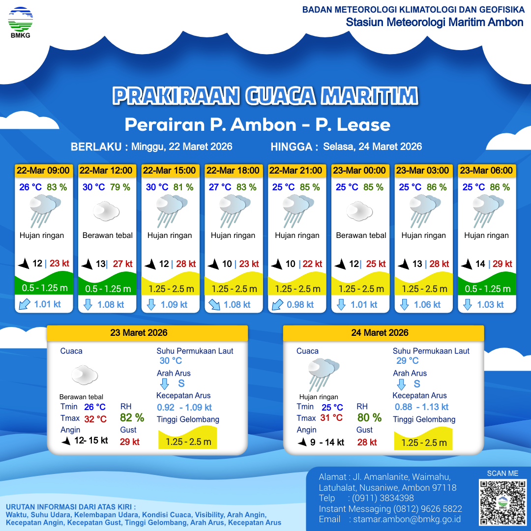 22 Mar 26, 17.00 2 jam kedepan | Barat Laut 13 kt Gust Peningkatan kecepatan angin yang singkat dan tiba-tiba : 27 kt | 1.4 m Sedang | Selatan 1.1 Knots | 25 °C | 86 % | |