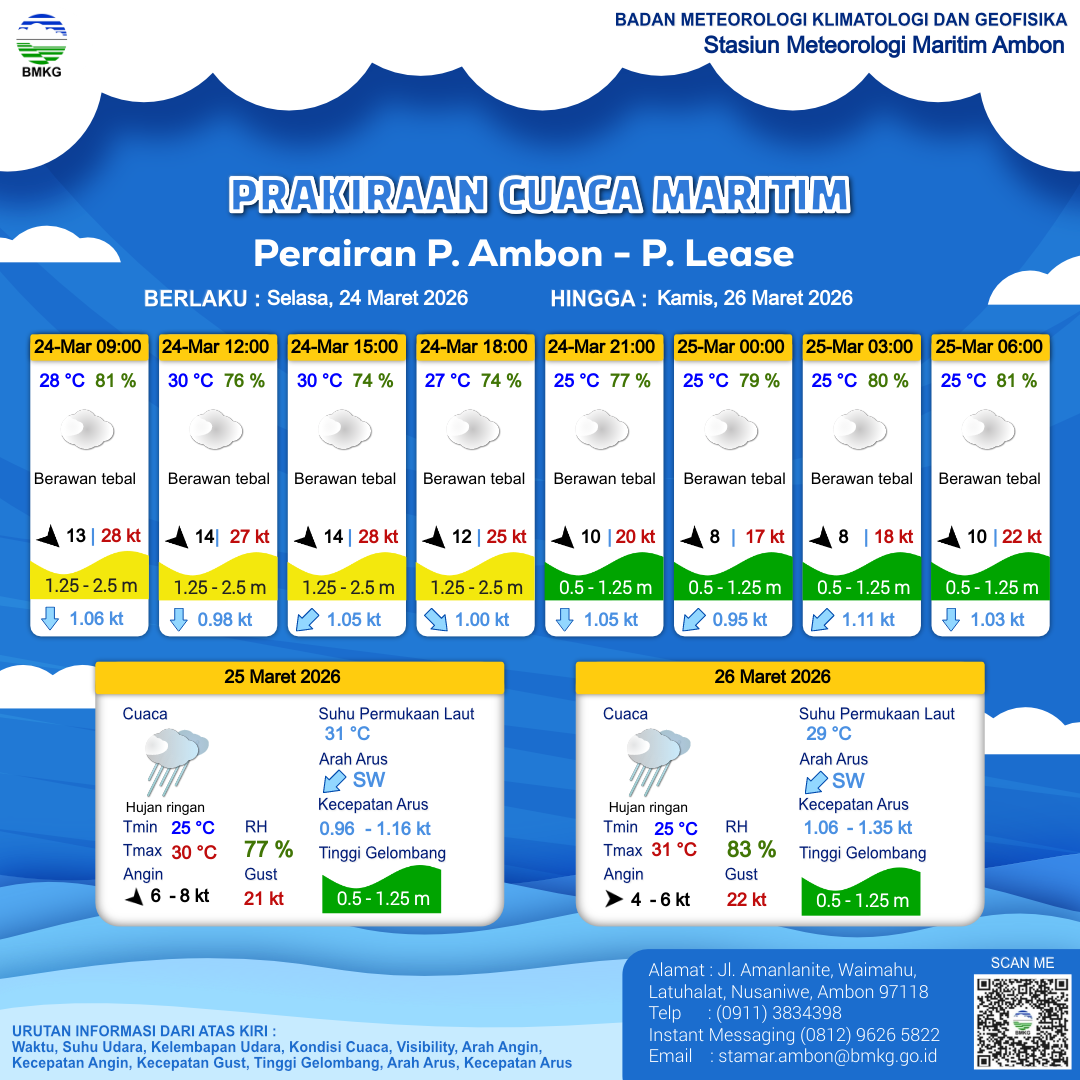 24 Mar 26, 21.00 3 jam kedepan | Barat Laut 10 kt Gust Peningkatan kecepatan angin yang singkat dan tiba-tiba : 22 kt | 1.1 m Rendah | Selatan 1.0 Knots | 25 °C | 81 % | |