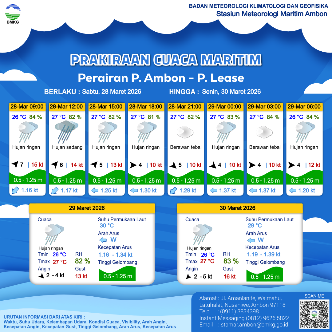 29 Mar 26, 08.00 9 jam kedepan | Barat 4 kt Gust Peningkatan kecepatan angin yang singkat dan tiba-tiba : 13 kt | 0.4 m Tenang | Barat Daya 1.1 Knots | 28 °C | 80 % | |