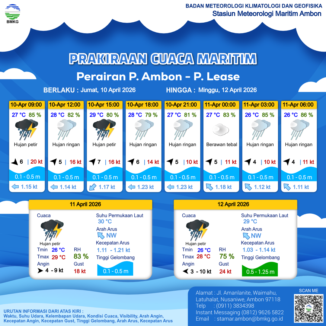 10 Apr 26, 06.00 2 jam kedepan | Barat Daya 7 kt Gust Peningkatan kecepatan angin yang singkat dan tiba-tiba : 16 kt | 0.5 m Rendah | Barat Daya 1.2 Knots | 29 °C | 80 % | |