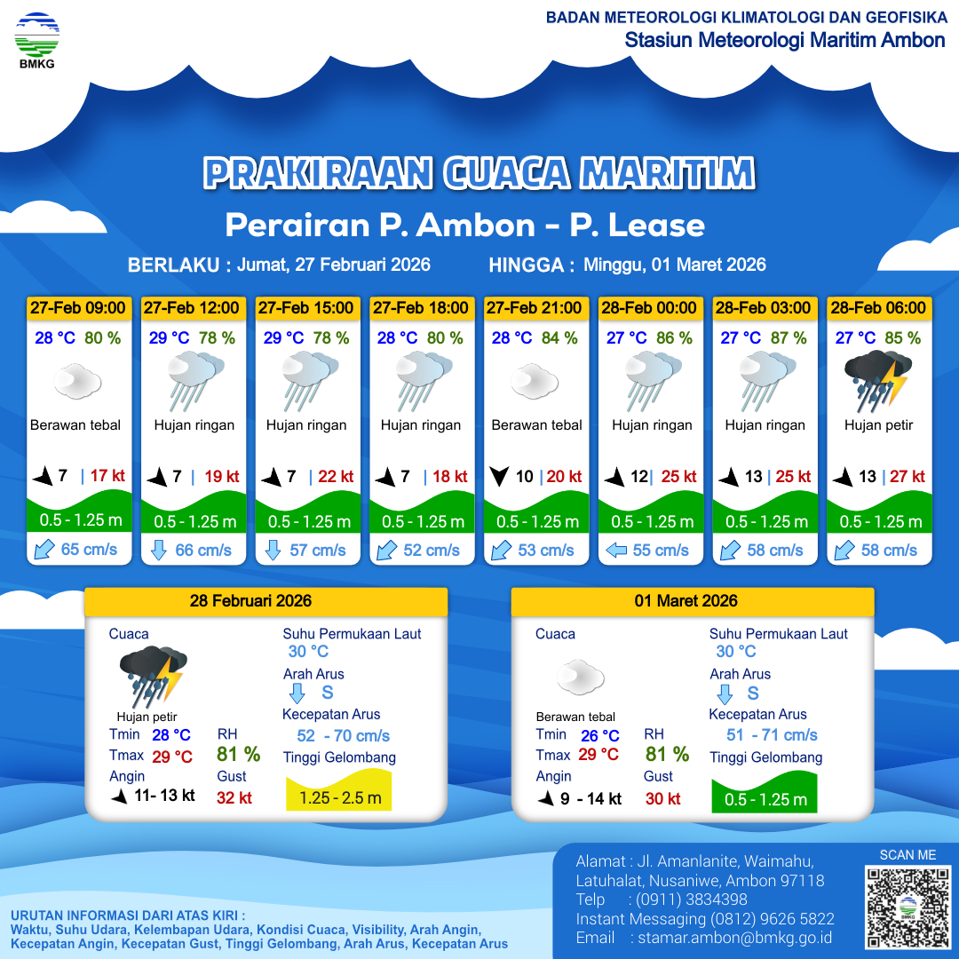 27 Feb 26, 23.00 2 jam kedepan | Hujan Petir | Barat Laut 13 kt Gust Peningkatan kecepatan angin yang singkat dan tiba-tiba : 25 kt | | | 28 °C | 84 % |