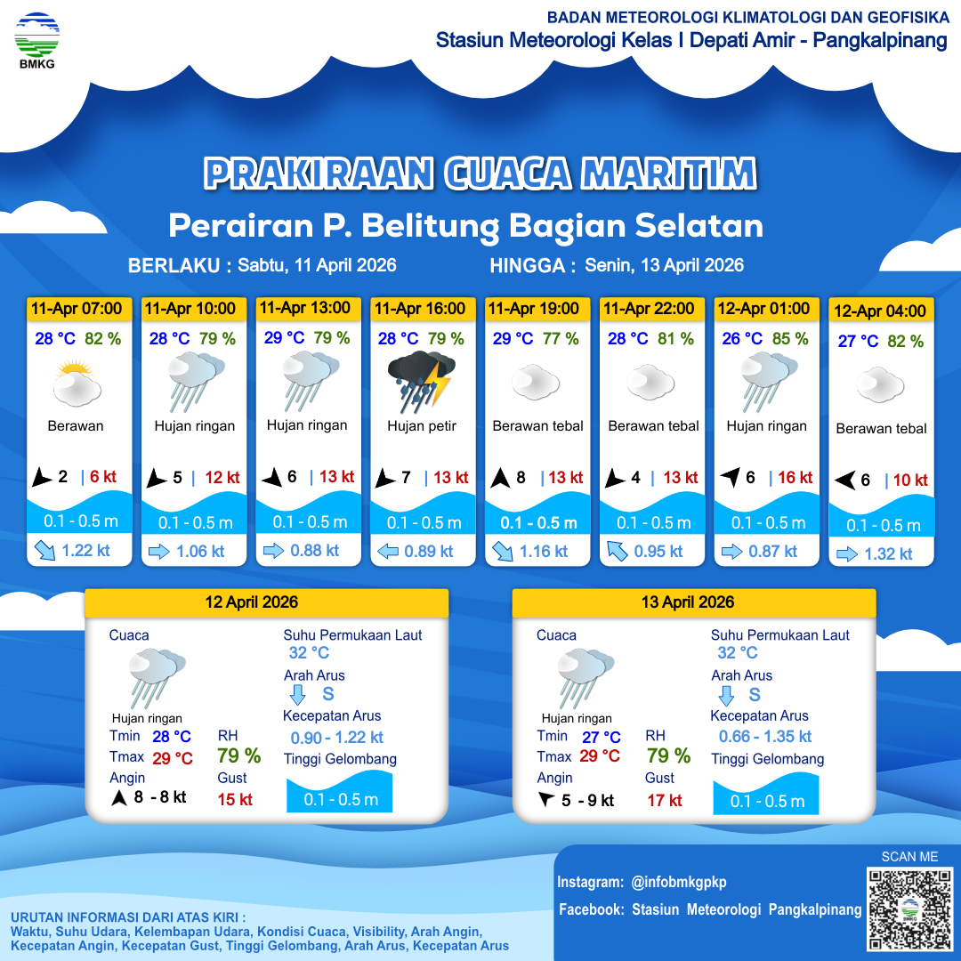 11 Apr 26, 23.00 3 jam kedepan | Berawan Tebal | Selatan 8 kt Gust Peningkatan kecepatan angin yang singkat dan tiba-tiba : 12 kt | | | 28 °C | 81 % |