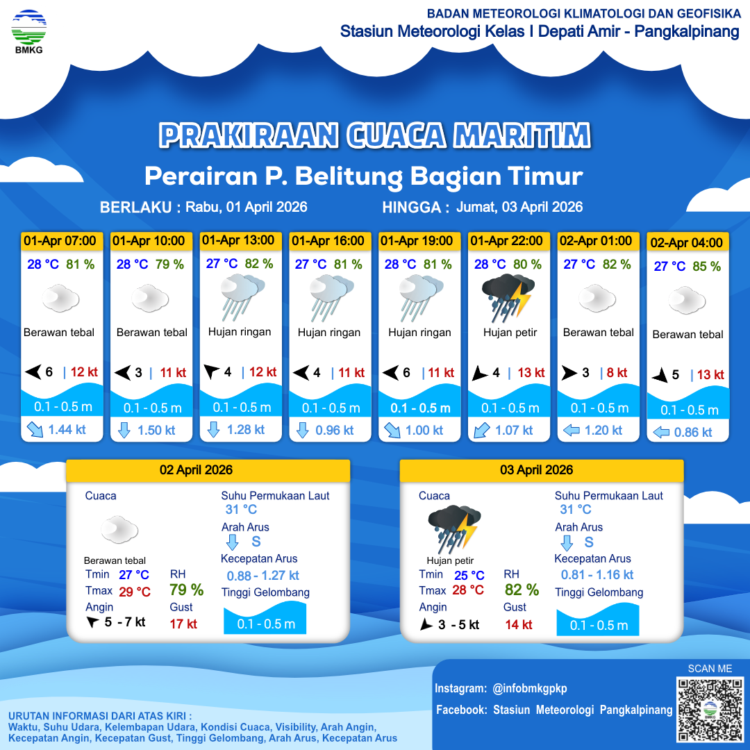 1 Apr 26, 17.00 2 jam kedepan | Barat 3 kt Gust Peningkatan kecepatan angin yang singkat dan tiba-tiba : 8 kt | 0.3 m Tenang | Barat 1.2 Knots | 28 °C | 81 % | |