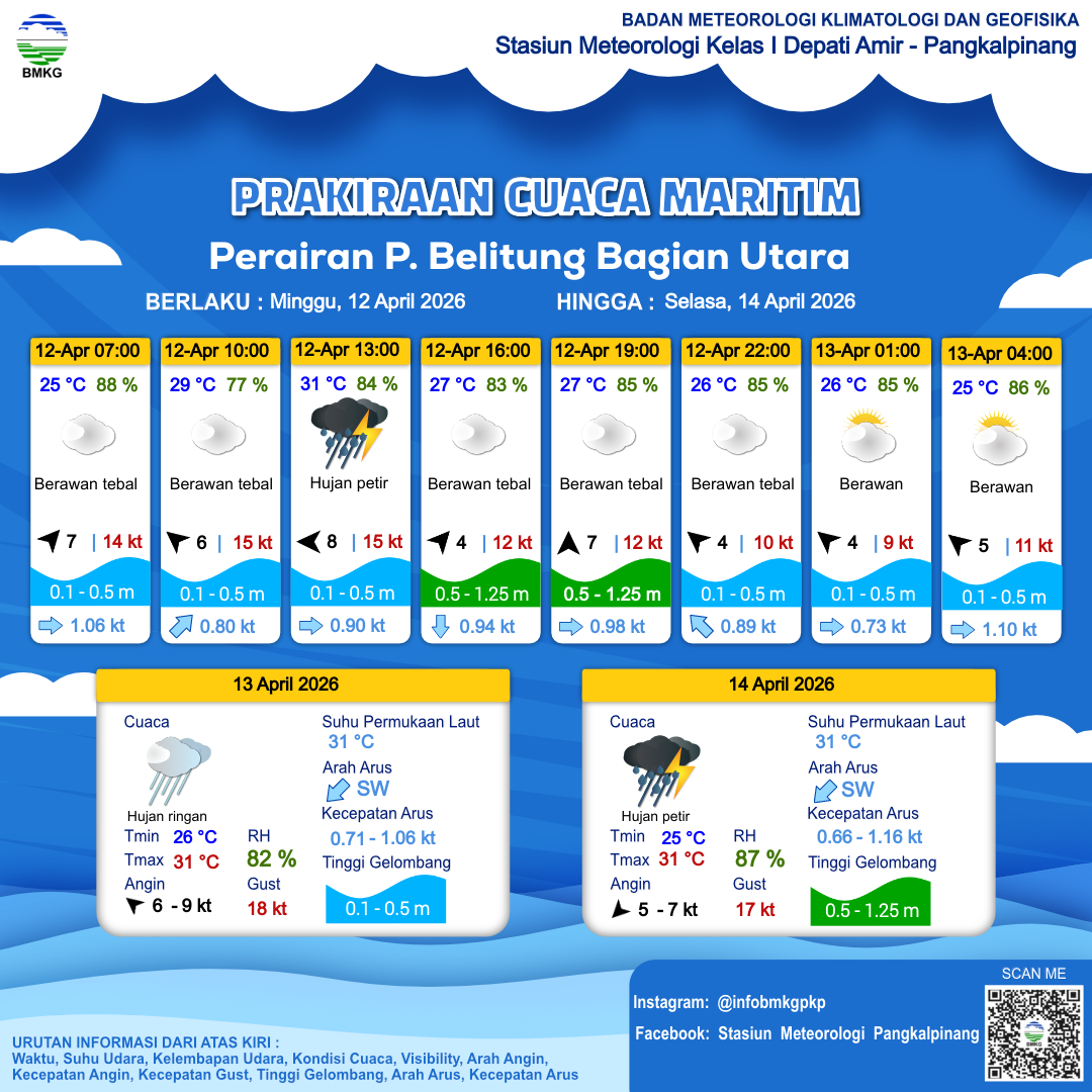 12 Apr 26, 06.00 4 jam kedepan | Timur 8 kt Gust Peningkatan kecepatan angin yang singkat dan tiba-tiba : 15 kt | 0.4 m Tenang | Timur 0.9 Knots | 31 °C | 84 % | |
